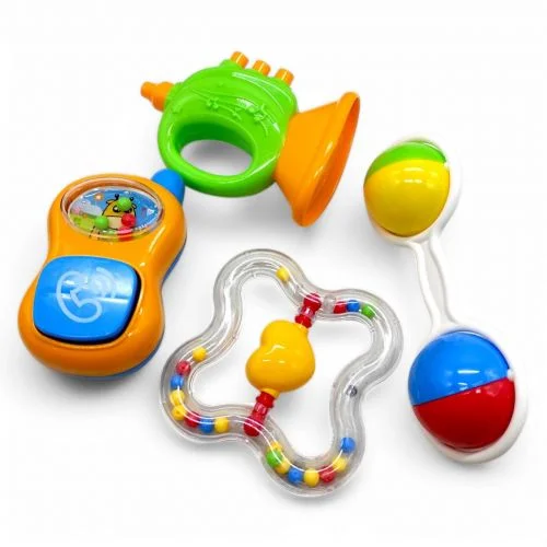 Набір дитячих брязкальця, 4 штуки - це ідеальний вибір для малюків з перших місяців життя! У комплект входять різноманітні види брязкальця: дудки-свистки, пискавки та класичні моделі з кульками всередині. Кожна іграшка створена із безпечних матеріалів, має зручну форму для маленьких ручок та яскравий дизайн, який привертає увагу дитини.