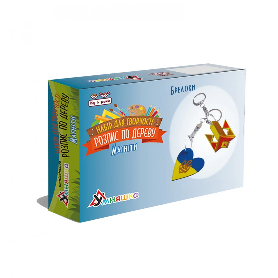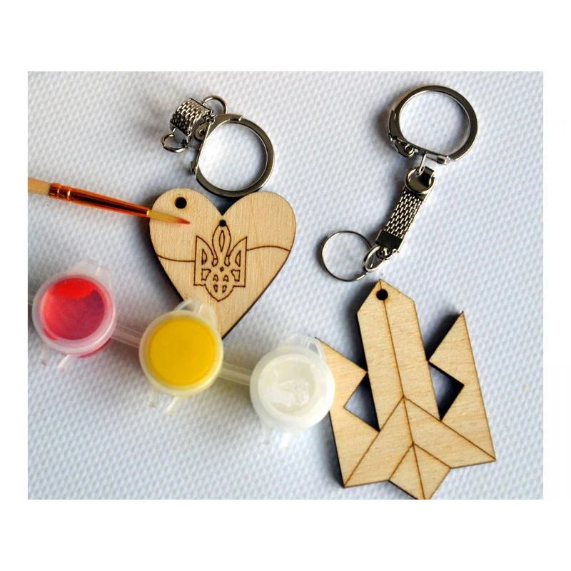 У наборі: 2 основи для розпису з фанери з нанесеними контурами, набір акрилових фарб з 6 кольорів, пензлик, магніт.