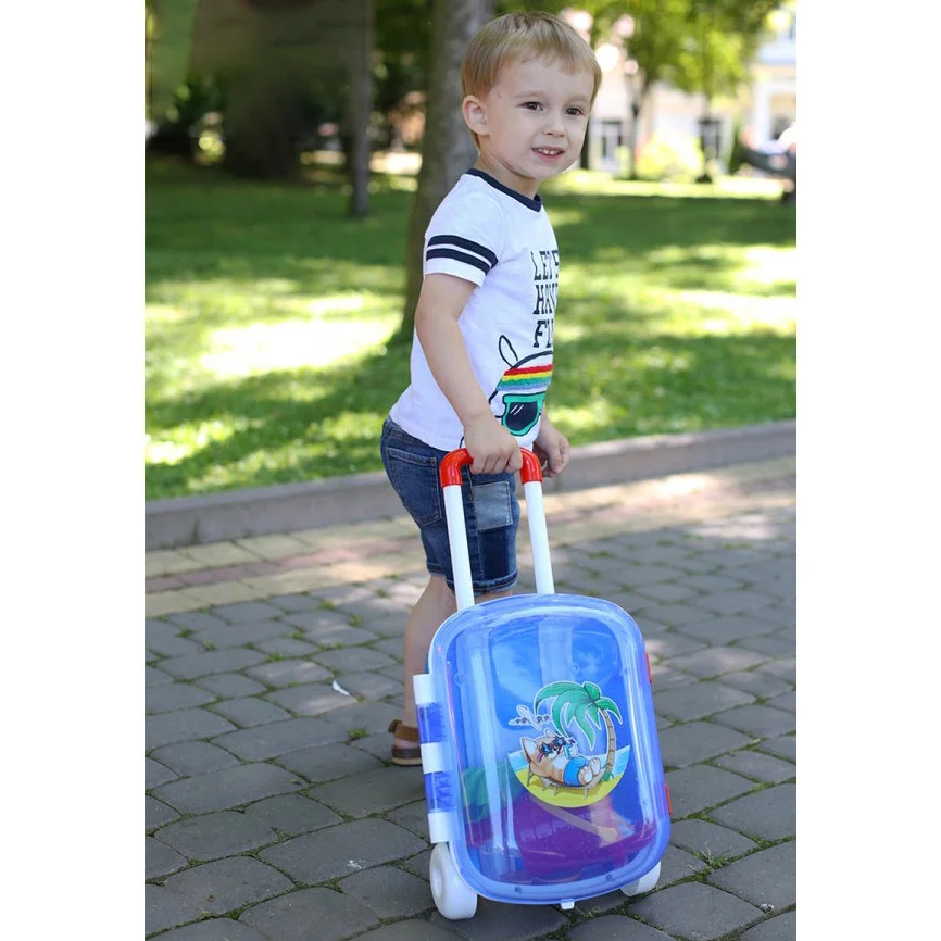 Така валіза цікавий, функціональний і дуже схожий на справжній «дорослий» валізу. Яскравий колір, прозора кришка і симпатична наклейка неодмінно привернуть увагу малят до іграшки. Зображення на кришці нанесено по технології IML (безпосередня інжекція малюнка). Такий малюнок не втрачає яскравості і є довговічним. Валіза комфортний для дітей різного віку і зростання завдяки ручці, яка регулюється. Відкрита кришка фіксується в декількох положеннях, тож дитина зможе легко збирати і виймати речі з валізи. А надійні засувки дозволяють закривати кришку і зберігати іграшки всередині валізи. Крім того великі, міцні колеса допомагають малюкам вільно перевозити валізу.