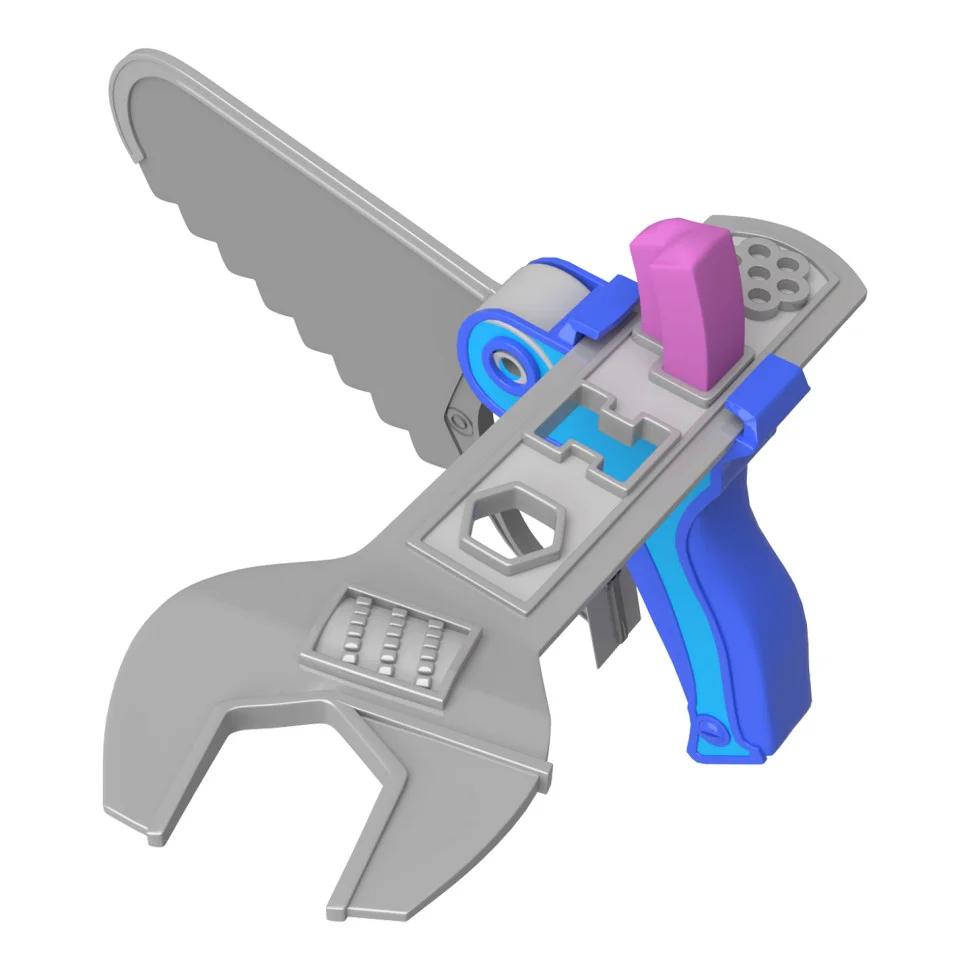 Тепер в малюка буде своя скринька з інструментами, така сама, як в тата! Пластикові інструменти залишають на тісті різні текстури та відбитки. Наприклад, можна зліпити собі дощечку, текстуровану як справжнє дерево, а потім випиляти пилкою з неї шпаківню! Або забивати молоточком абсолютно безпечні кольорові цвяшки з тіста! Можна також з’єднати гайковий ключ з пилкою і витискати ковбаски тіста різної форми! Весела розвиваюча гра зацікавить не лише хлопчиків, але й дівчаток!