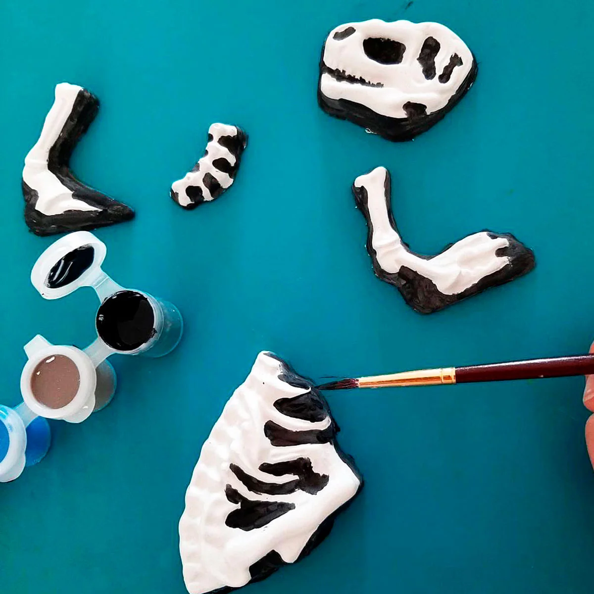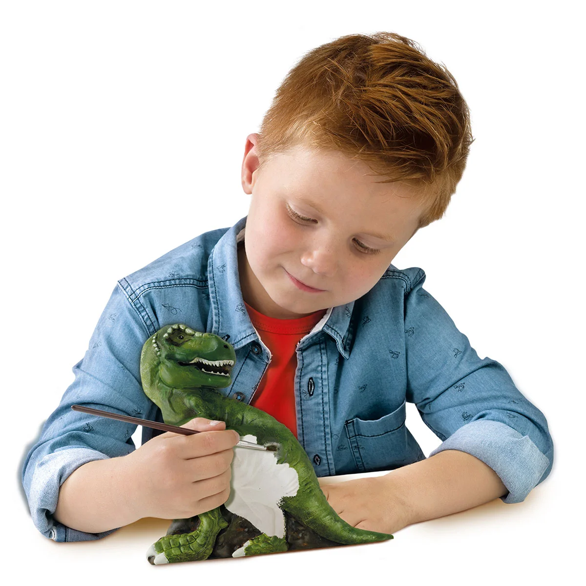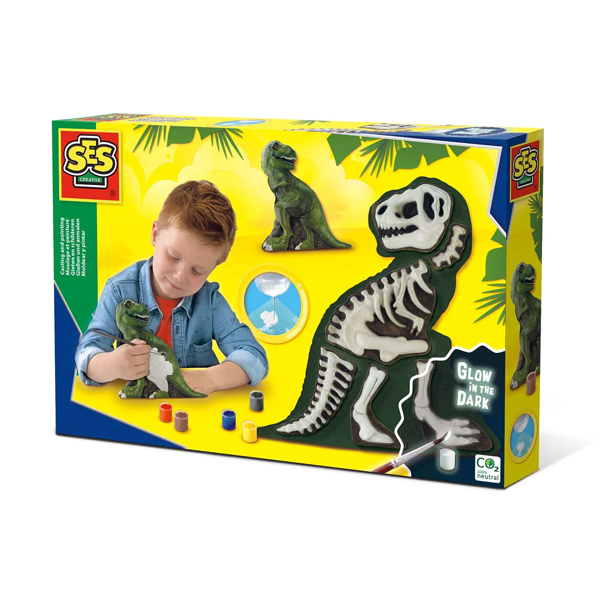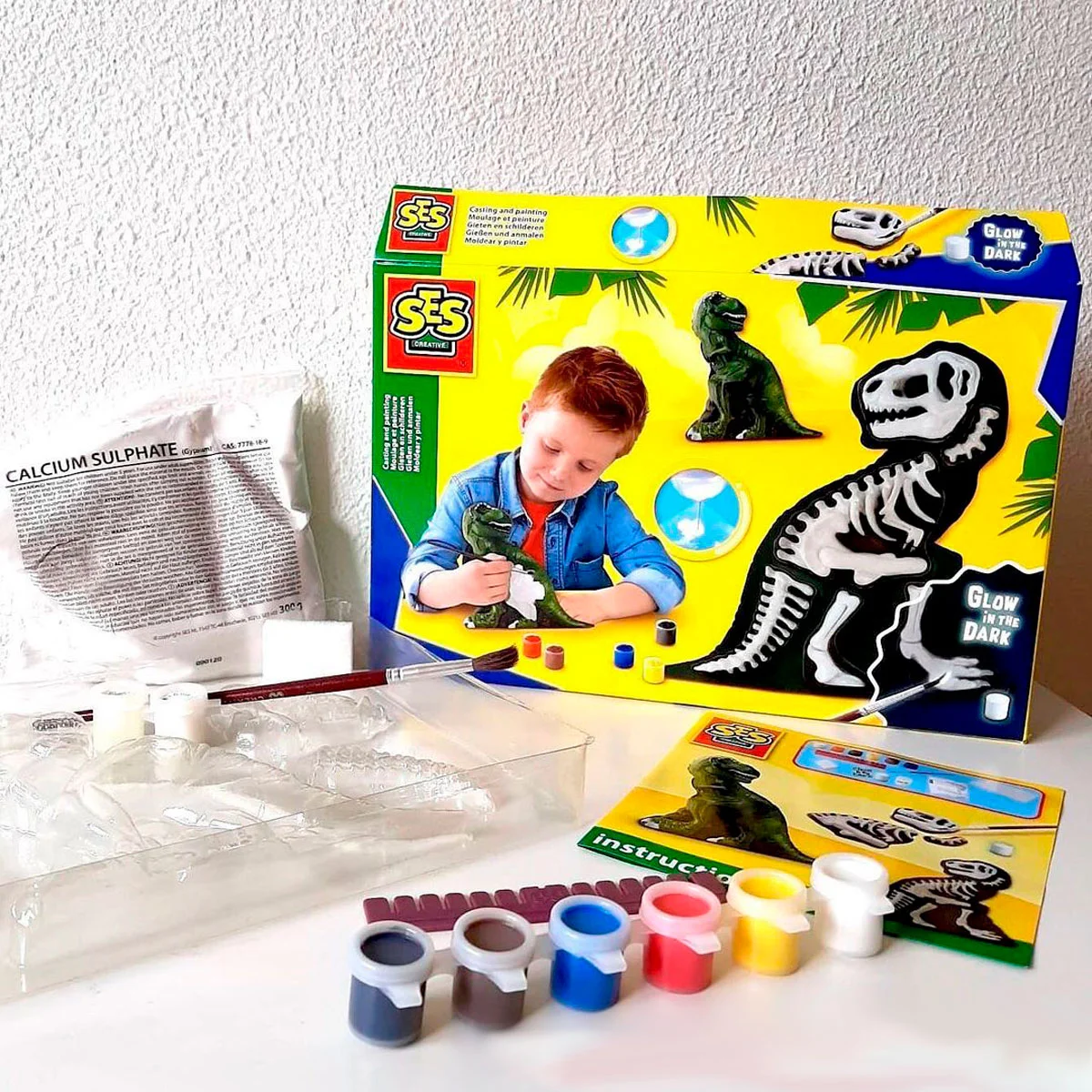 Цей фантастичний набір дозволить Вам створити свого унікального Ті-Рекса. З однієї сторони Ви будете бачити самого динозавра, а з іншої – його скелет! Залийте гіпс до формочок і зачекайте, поки вони не висохнуть. Потім розфарбуйте частини динозавра різнокольоровими спеціальними фарбами, що світяться. Поставте свій витвір мистецтва у кімнаті і ввечері ви побачите, що кістки скелета світяться у темряві!
