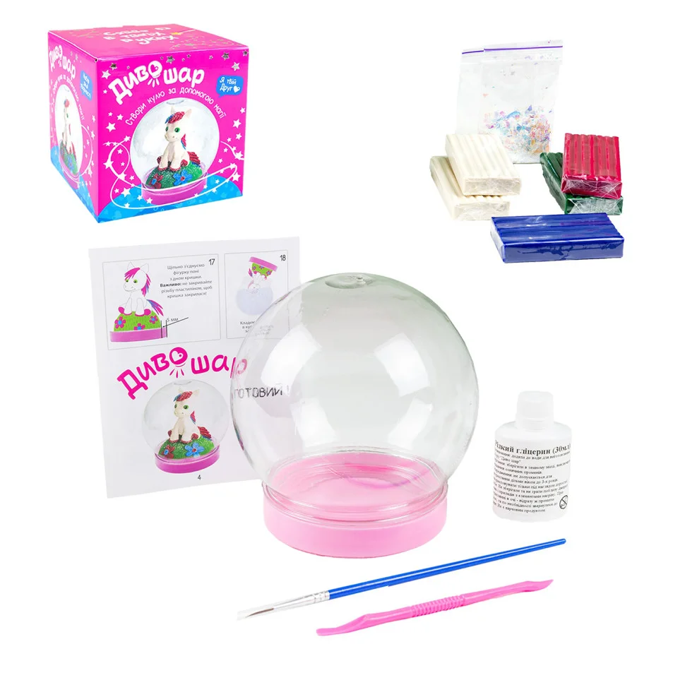Комплектація: куля-банка пластикова, пластилін, стек, гліцерин, блискітки, пензлик, інструкція.