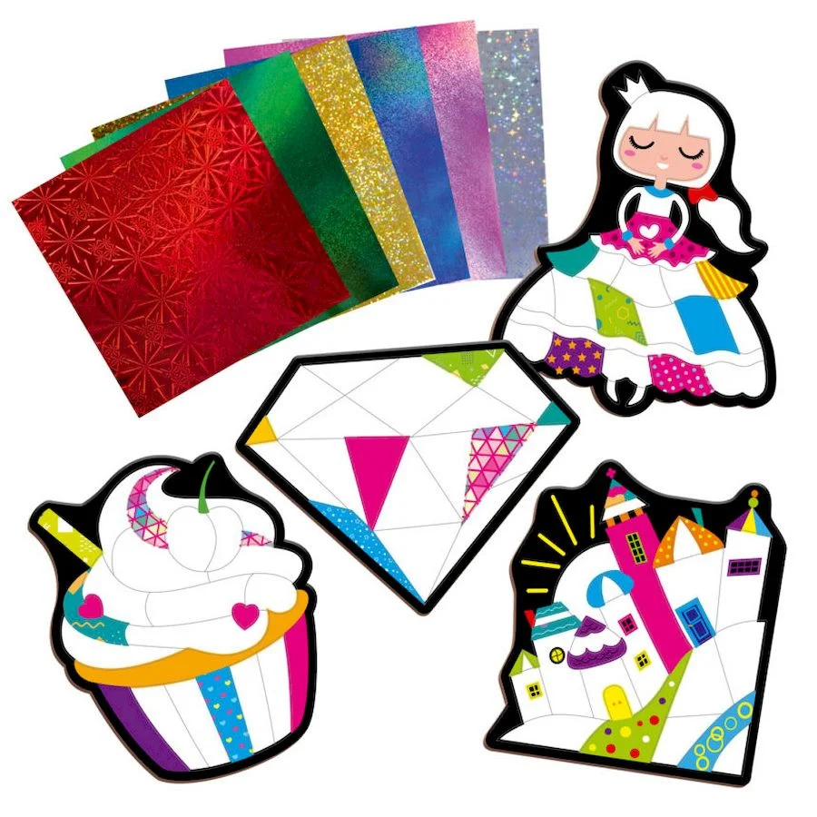 Пориньте у світ творчості та натхнення разом із креативним набором голографічної фольги від Vladi Toys! Додайте сяйва та кольору картинкам із зображеннями принцеси, замку, тістечка та діаманту.