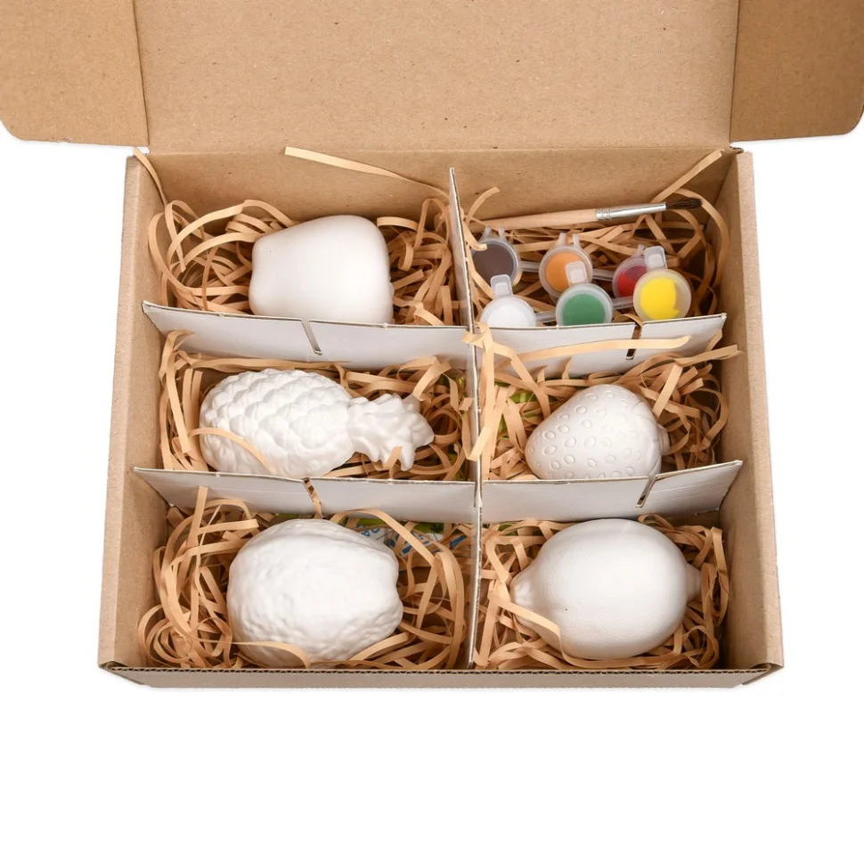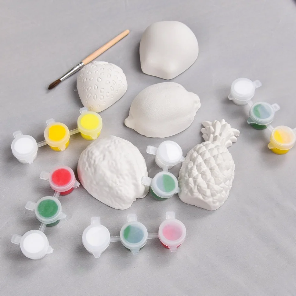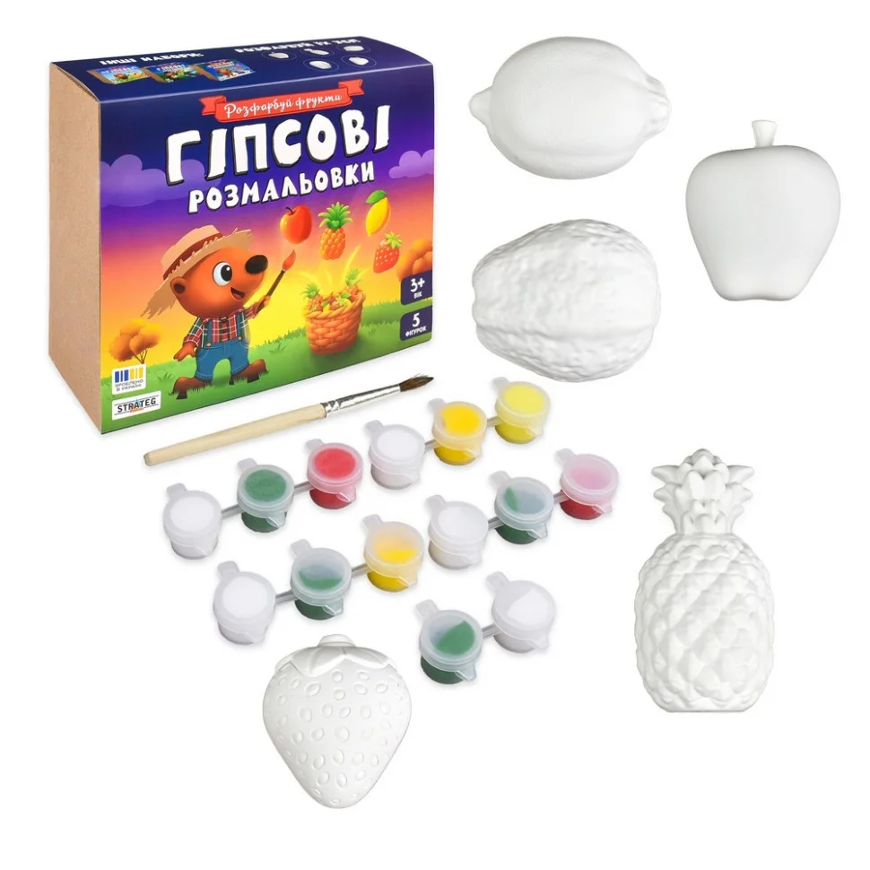 У набір входять 5 гіпсових фігурок у вигляді найсоковитіших фруктів та ягід: яблука, груші, лимона, полуниці та ананаса. Завдання просте, але захоплююче: розфарбувати їх яскравими фарбами та пензликом, які є в комплекті, і перетворити звичайні гіпсові заготовки на справжні мистецькі шедеври.