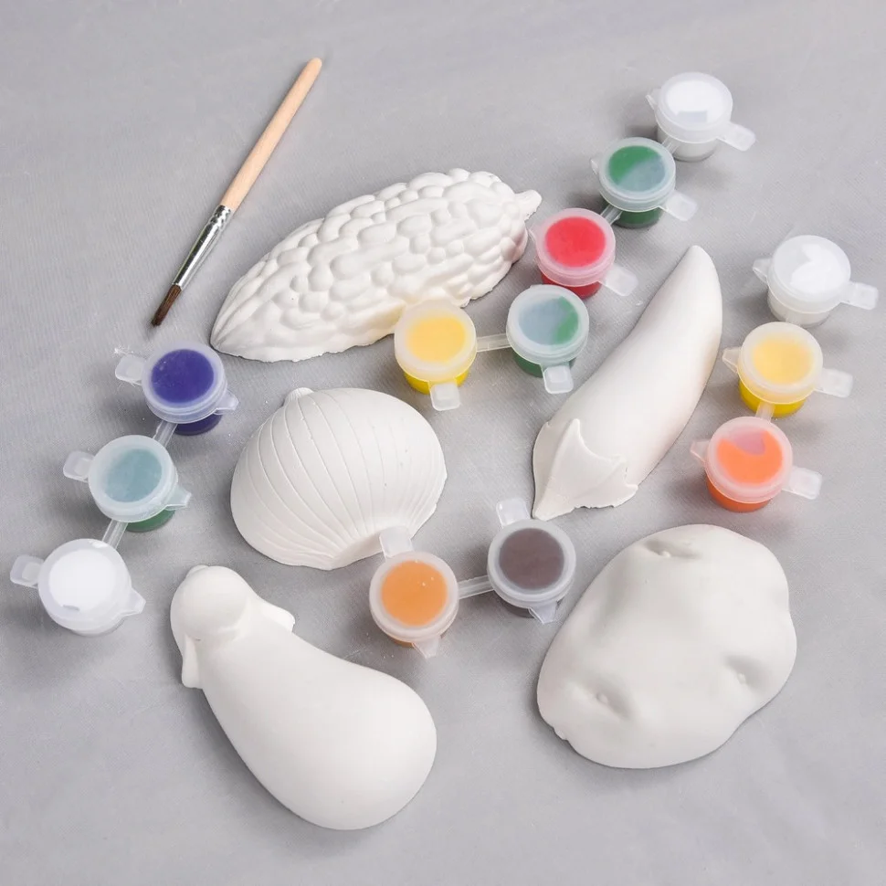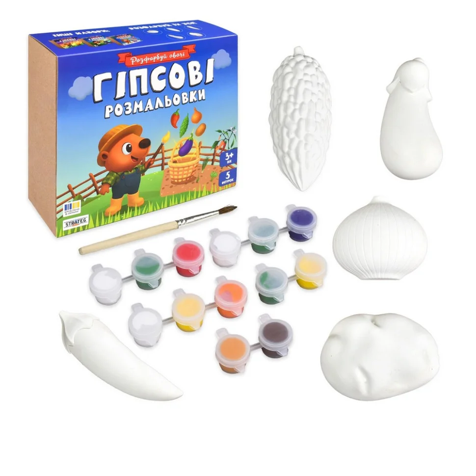 Перетворіть звичайний гіпс на власний маленький город, наповнений яскравими кольорами! Набір Гіпсові Розмальовки «Розфарбуй овочі» дозволить вашій дитині поринути у веселий світ творчості та розфарбувати 5 гіпсових фігурок у вигляді улюблених овочів: баклажана, цибулі, картоплі, перцю та момордики.