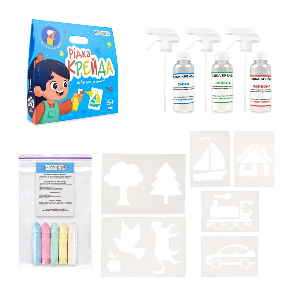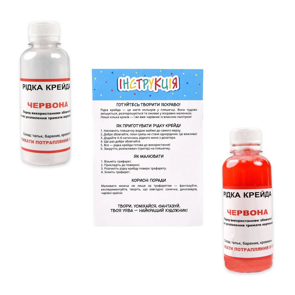 Творчий набір "Рідка крейда" перетворює звичайну пляшечку на чарівний інструмент для малювання. Просто додай воду та кілька крапель рідкого мила - і отримай яскраву, готову до розпилення фарбу. Створи власний шедевр за допомогою трафарету або фантазуй без обмежень!