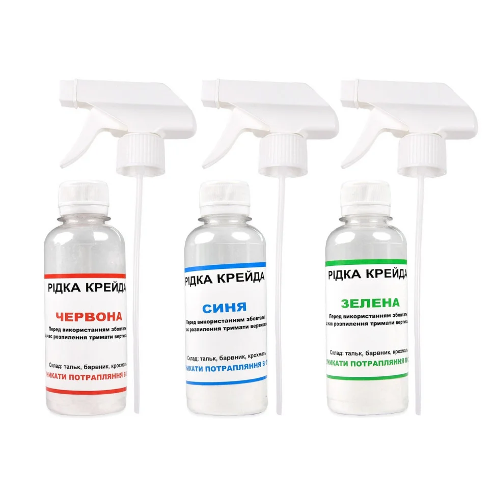 Комплектація: пляшки з сумішшю - 3 шт., інструкція - 1 шт., зіп-пакет - 1 шт. крейда - 5 шт., тригер - 3 шт., трафарети - 6 шт.