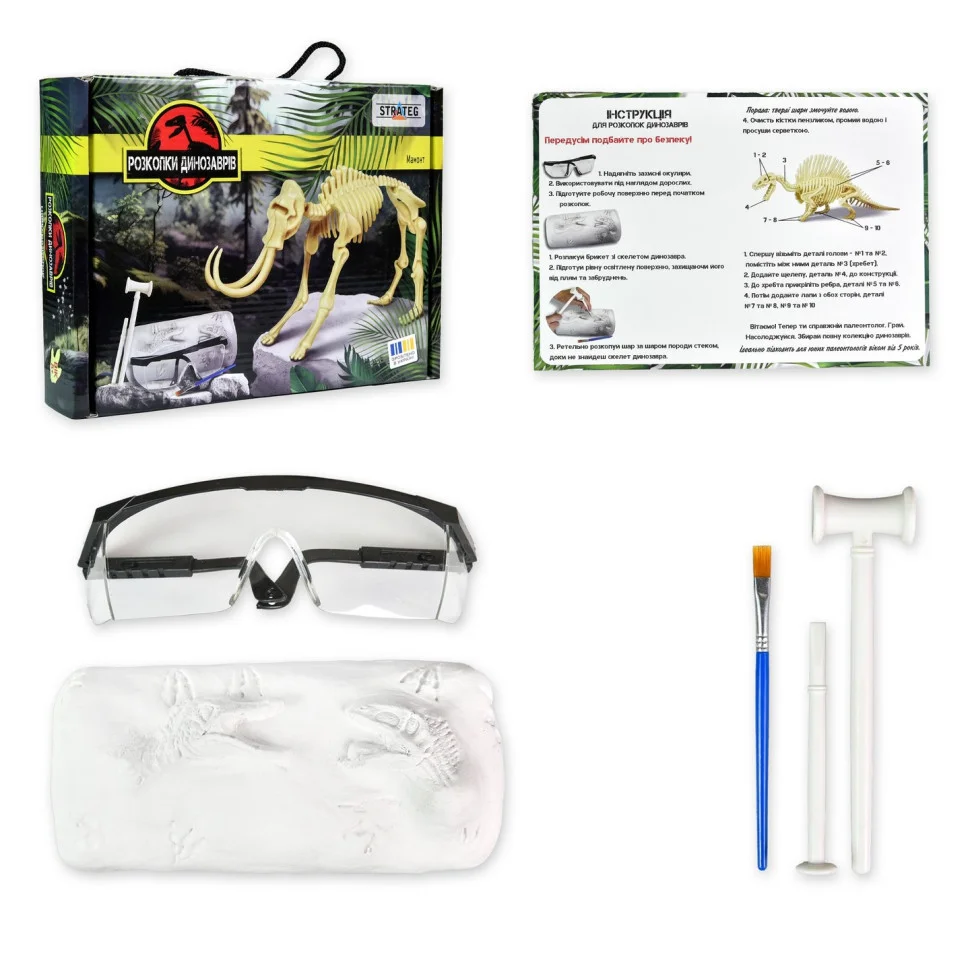 Набір для творчості "Розкопки динозавра" — чудова знахідка для юних дослідників! У комплекті ви знайдете все необхідне: інструменти, захисні окуляри, гіпсовий брикет зі скелетом динозавра та покрокові інструкції. Здається, що всі скам'янілості вже давно відкриті, але в нас є таємний запас! Час вирушати на розкопки та робити власні великі відкриття!