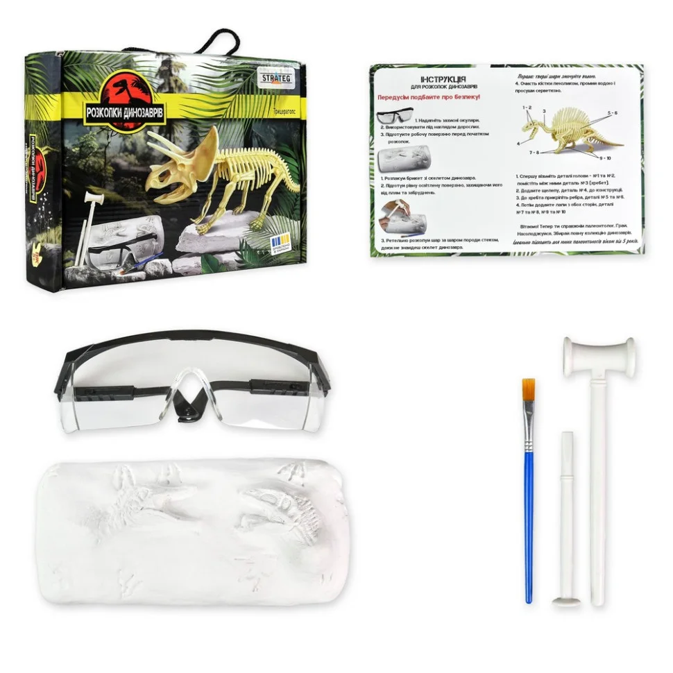 Набір для творчості "Розкопки динозавра. Трицератопс" — чудова знахідка для юних дослідників! У комплекті ви знайдете все необхідне: інструменти, захисні окуляри, гіпсовий брикет зі скелетом динозавра та покрокові інструкції. Здається, що всі скам'янілості вже давно відкриті, але в нас є таємний запас! Час вирушати на розкопки та робити власні великі відкриття!
