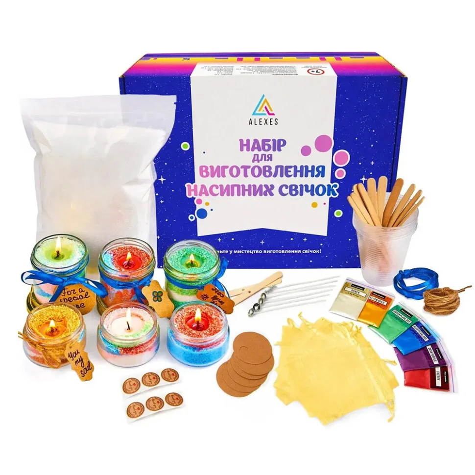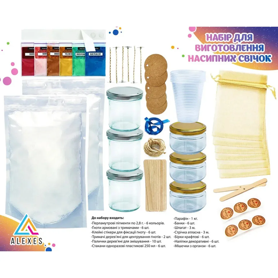 Цей набір дозволяє вам створити яскраві насипні свічки власноруч та оригінально оформити їх для подарунків чи власного використання.