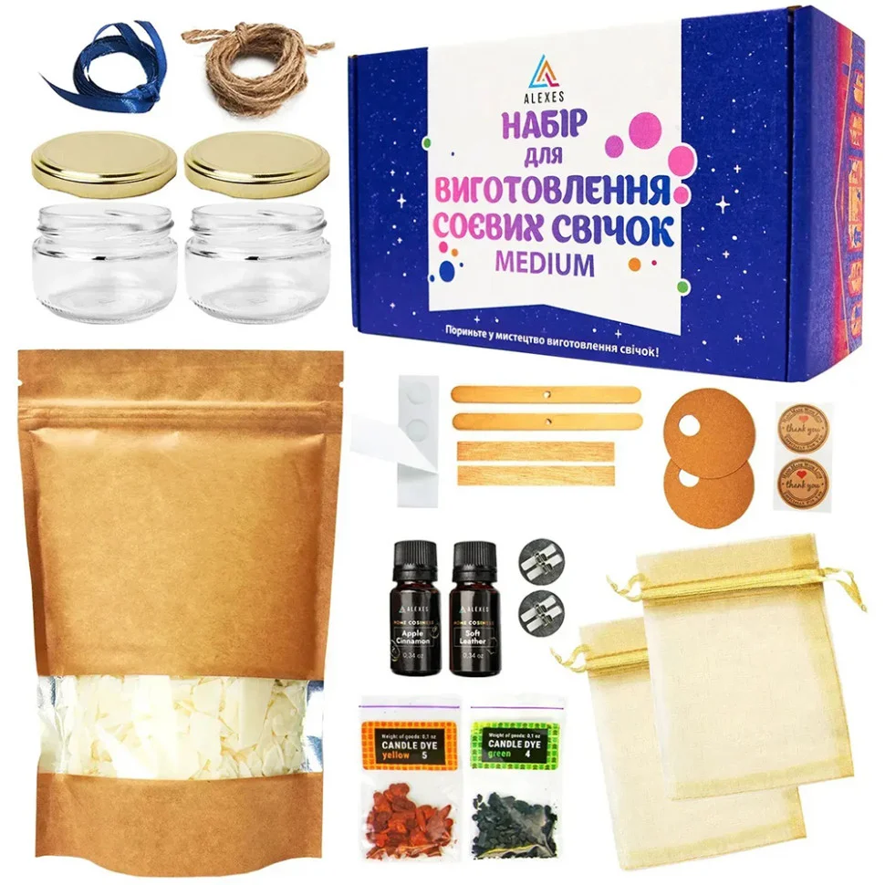 Цей набір дозволить вам створити унікальні та ароматні соєві свічки власноруч, з дбайливо підібраними матеріалами та інструментами.