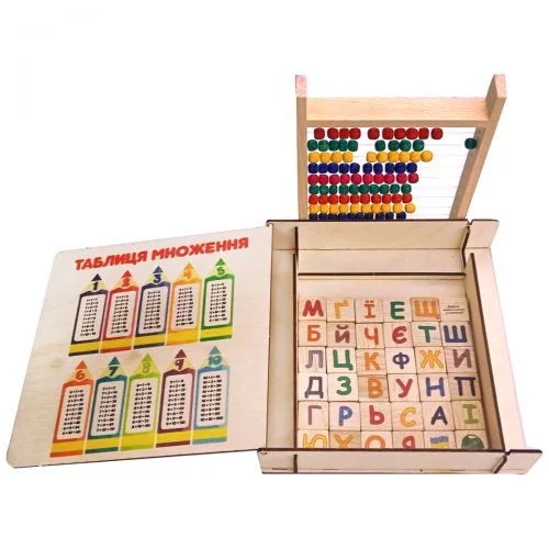 Комплектація: дерев'яна рахівниця, дерев'яні плашки з символами українського алфавіту, цифрами від 0 до 9 і математичними символами, таблиця множення, поверхня для малювання маркером або крейдою, що стирається, дерев'яний ящик для зберігання елементів набору