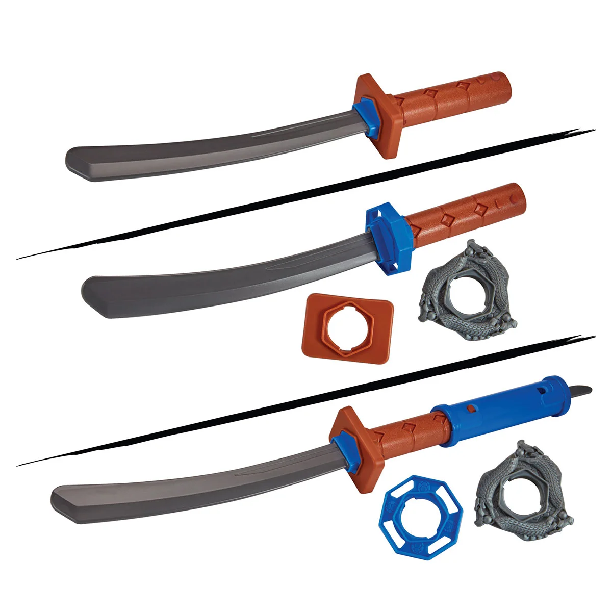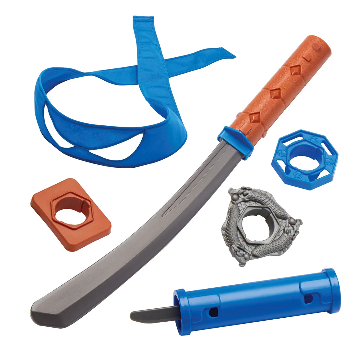 Коли лиходії атакують, вивільни силу своєї катани, вставивши іграшкове лезо до рукоятки меча! Вирівняй з’єднувальні роз’єми та кнопки, та поверни рукоятку, щоб зафіксувати лезо.