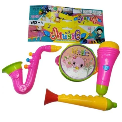 Пластикові набори музичних інструментів для дітей. У ньому є: бубон, мікрофон, сопілка та саксофон. Мікрофон, сопілка та саксофон, якщо в них подуть, видають характерний звук дудки. Цей набір сприяє розвитку музичних навичок, сприйняття звуків і вселяє дітям інтерес до творчості та музики.