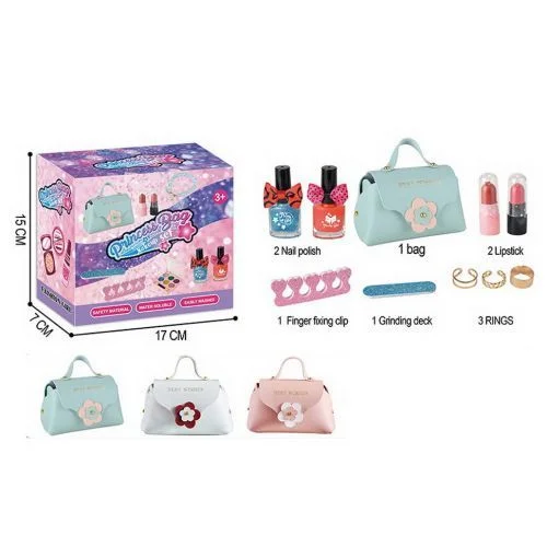 Великий набір косметики обовʼязково порадує маленьких принцес. У комплекті є елегантна сумочка, в якій дитина зможе зберігати своє приладдя, набір з 3-х каблучок, 2 лаки для нігтів, 2 помади для губ, пилка для нігтів та роздільник пальців для педикюру.
