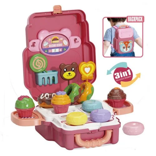 Ігровий набір, який обов'язково зацікавить будь-яку дитину. У наборі є іграшкові десерти (21 елемент) такі, як: пончики, льодяники, пирожки, кекси. За допомогою спеціальних елементів, які є в наборі, рюкзак можна перетворити на стійку з десертами. У наборі є тканинні шлейки для рюкзака. Набір призначений для дітей віком від 3-х років.