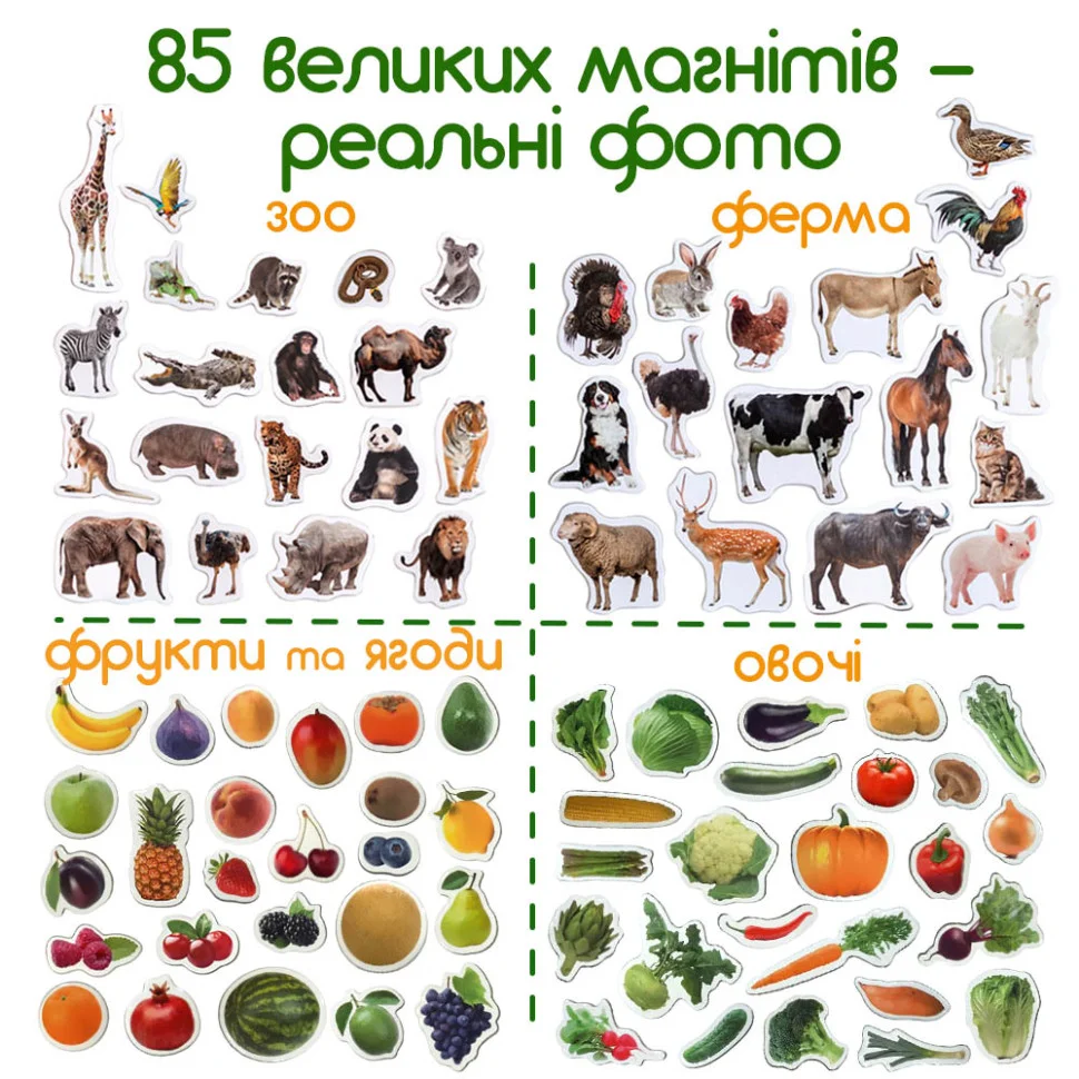 Тварини ферми і зоопарку, овочі, фрукти і ягоди - всі ці магніти в одній коробці! З ними можна грати нескінченно! Грай, вивчай, порівнюй, групуються, вигадуй історії, вважай! У металевій коробці ви знайдете 85 великих, міцних, зручних магнітів. Кожне зображення - реальне фото. З магнітами можна грати скрізь: на холодильнику або магнітної дошці, на підлозі або столі. Кращий подарунок для дитини - корисний і цікавий.