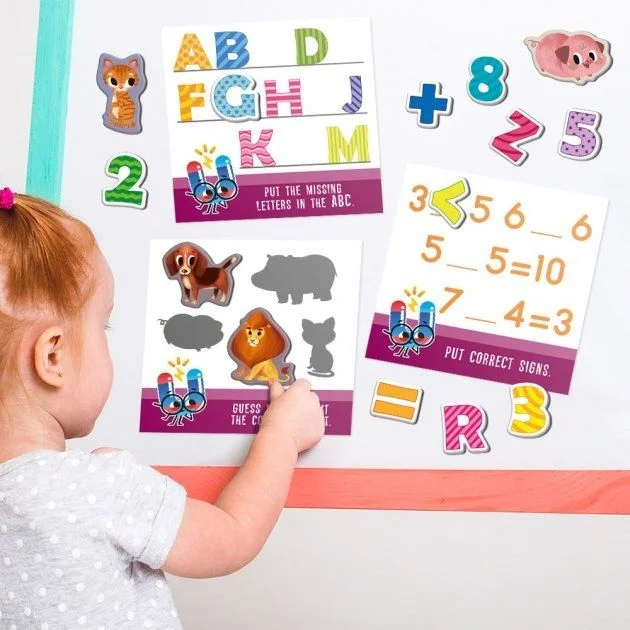 У набір входять магніти у вигляді букв англійського алфавіту, математичних знаків, цифр і тварин, а також картки з іграми-завданнями. Дитина буде шукати правильні літери і цифри, вважати кути геометричних фігур, розставляти потрібні знаки, складати, віднімати, складати слова, попутно розвиваючи увагу, логіку, мислення, память. Всі елементи великі, довговічні. Товщина кожного - 3 мм. Захист - ламінація. Кути безпечно заокруглені. Для дітей від 3 років. Комплектація: 80 магнітів, 10 карток. Розмір коробки: 20,3 х 20,3 х 4,0 см.
