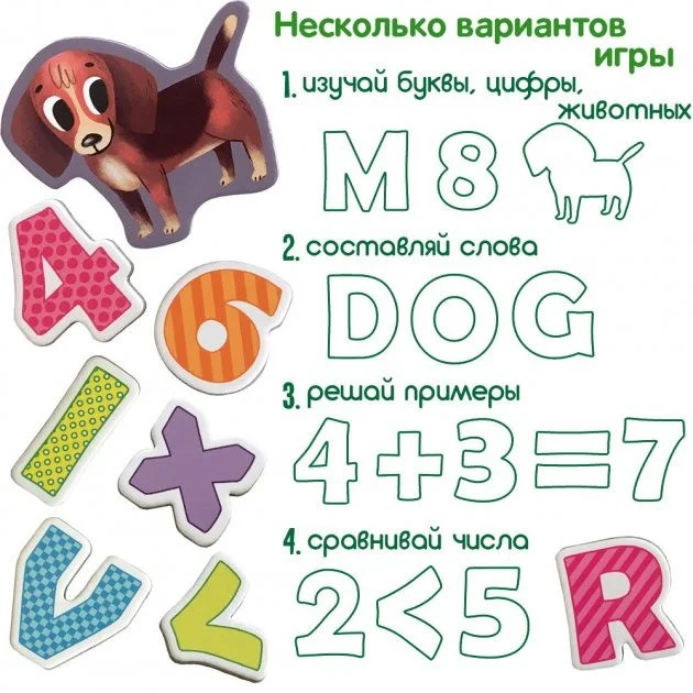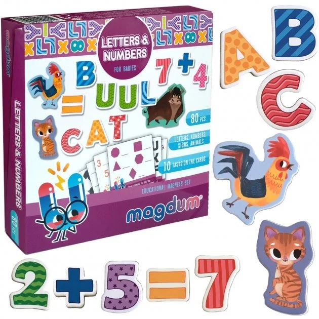 У набір входять магніти у вигляді букв англійського алфавіту, математичних знаків, цифр і тварин, а також картки з іграми-завданнями. Дитина буде шукати правильні літери і цифри, вважати кути геометричних фігур, розставляти потрібні знаки, складати, віднімати, складати слова, попутно розвиваючи увагу, логіку, мислення, память. Всі елементи великі, довговічні. Товщина кожного - 3 мм. Захист - ламінація. Кути безпечно заокруглені. Для дітей від 3 років. Комплектація: 80 магнітів, 10 карток. Розмір коробки: 20,3 х 20,3 х 4,0 см.
