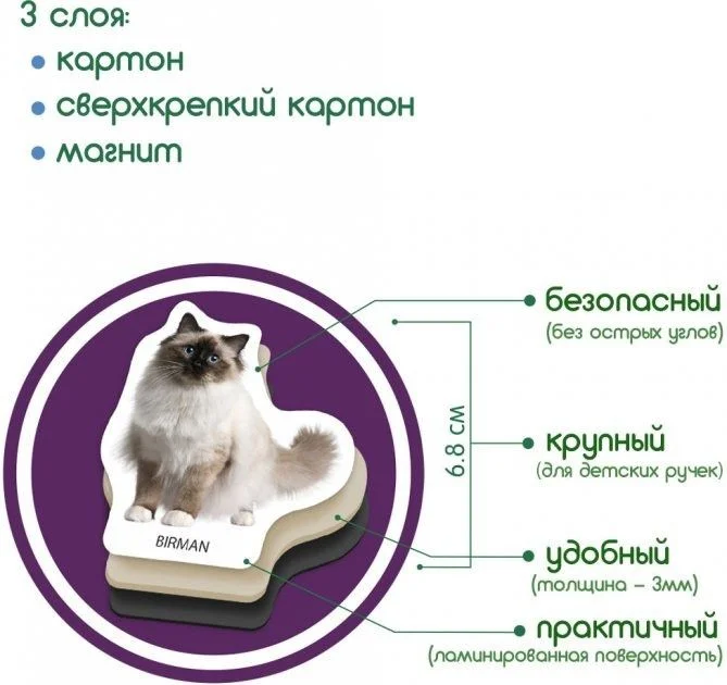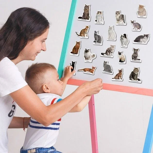 Набір ламінованих магнітних фігурок «Породи кішок». За допомогою барвистих магнітів діти познайомляться з породами домашніх вихованців, навчаться розрізняти їх за особливими ознаками. Фігурками зручно грати на будь-якій поверхні, оскільки вони великі, міцні, дуже практичні. Для дітей від 3 років. Комплектація: 22 магніту із зображенням котів. Розмір коробки: 12 × 17 × 3,7 см.