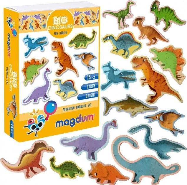 Набір ламінованих магнітних фігурок «Великі динозаври». За допомогою барвистих магнітів діти познайомляться з тваринами, навчаться розрізняти розміри і особливі ознаки. Фігурками зручно грати на будь-якій поверхні, оскільки вони великі, міцні, дуже практичні. Для дітей від 3 років. Комплектація: 15 магнітів з тваринами. Розмір коробки: 12 × 17 × 3,7 см.