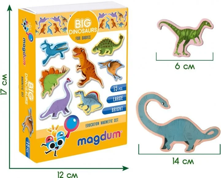 Набір ламінованих магнітних фігурок «Великі динозаври». За допомогою барвистих магнітів діти познайомляться з тваринами, навчаться розрізняти розміри і особливі ознаки. Фігурками зручно грати на будь-якій поверхні, оскільки вони великі, міцні, дуже практичні. Для дітей від 3 років. Комплектація: 15 магнітів з тваринами. Розмір коробки: 12 × 17 × 3,7 см.