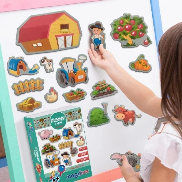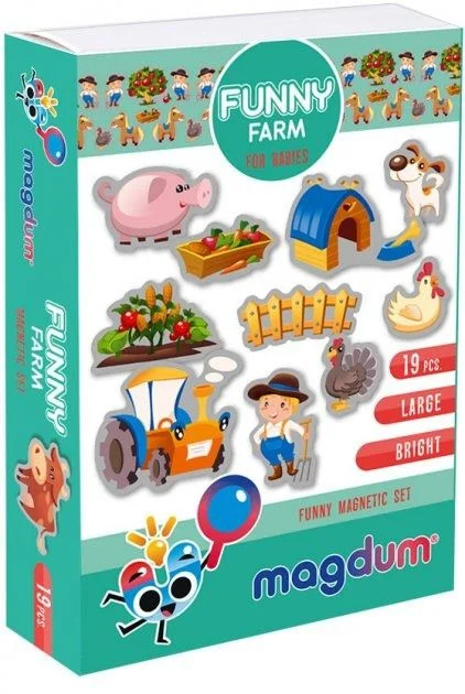 Набір магнітних фігурок «Весела Ферма» для раннього розвитку. За допомогою яскравих магнітів діти грають в ферму, знайомляться з тваринами, культурними рослинами, вчаться розрізняти розміри і особливі ознаки. Магнітами зручно грати на будь-якої поверхні: вони великі, міцні, дуже практичні завдяки ламінації. Для дітей від 3 років. Комплектація: 19 магнітів. Розмір коробки: 12 × 17 × 3,7 см.