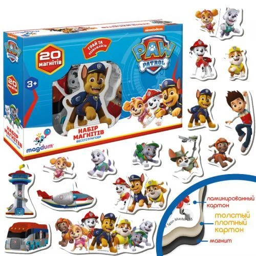 Набір магнітів для веселої та навчальної гри. Фігурки в стилі популярного мультфільму "Щенячий патруль". Всі деталі оснащені магнітною основою, ламінованої поверхнею і міцним картоном. У комплекті 20 магнітів персонажів мультфільму. Набір виготовлений з якісних і безпечних матеріалів. Для дітей від 3-х.