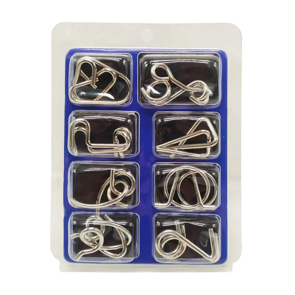 Набір восьми фігурні міні-головоломки з металу. Завдання у всіх одне: роз'єднати дві деталі, не застосовуючи при цьому фізичної сили (головоломка вирішується легкими рухами руки).