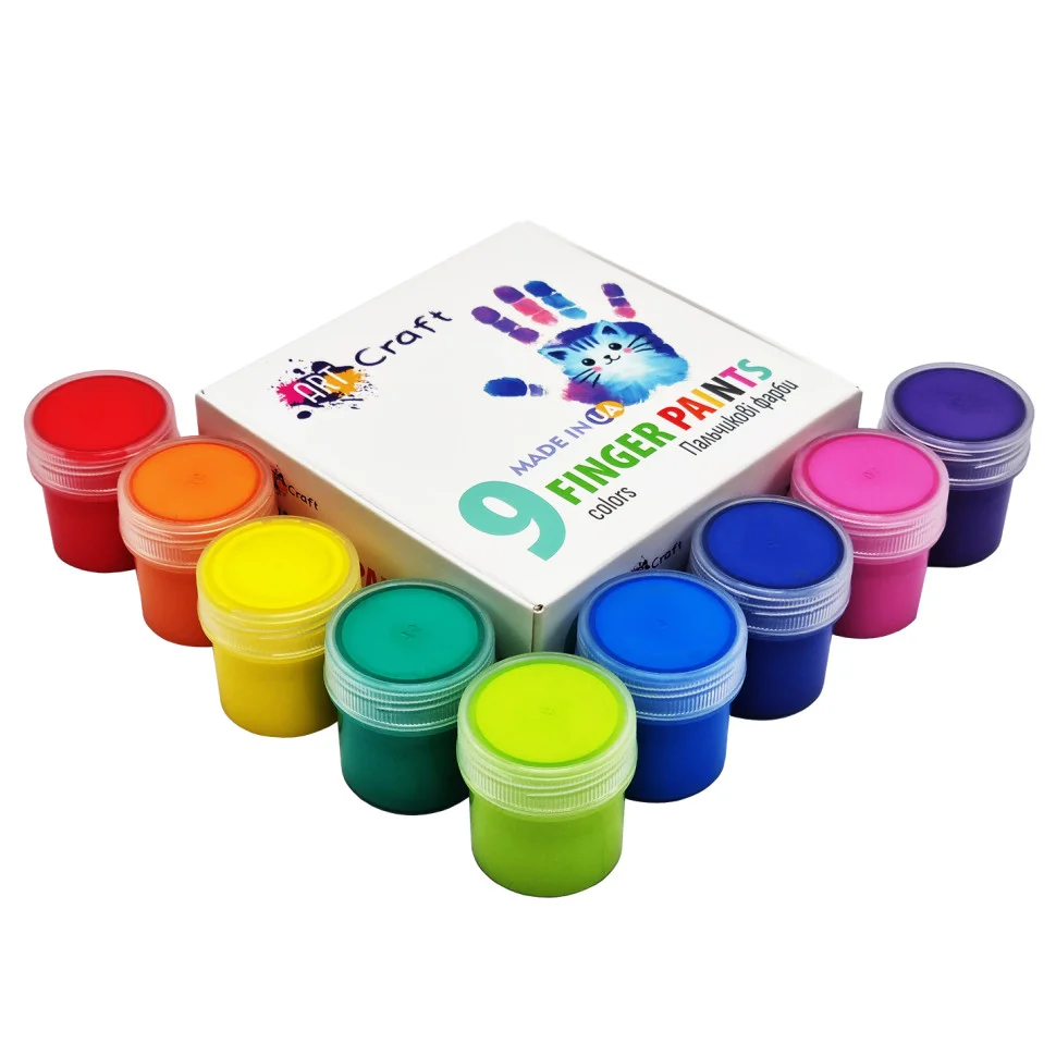 Набір пальчикових фарб 9 кольорів (синій, зелений, жовтий, червоний, помаранчевий, рожевий, салатовий, блакитний, фіолетовий). Фарби підходять для малювання пензликами, спонжами або безпосередньо пальчиками. ПОПЕРЕДЖЕННЯ! Для дітей віком від 3-х років. Не допускати потрапляння до рота та очей складових набору. ОСОБАМ ВІКОМ ДО 14 РОКІВ ВИКОРИСТОВУВАТИ ПІД НАГЛЯДОМ БАТЬКІВ! Містить дрібні деталі. Після використання ретельно вимити руки теплою водою з милом. Особливості умов зберігання: зберігати в сухому місці при температурі від +5 до +30 С та відносній вологості не більше 75%. Фарби зберігати зі щільно закритими кришечками, якомога далі від сонячних променів для запобігання передчасного висихання. Продукція відповідає встановленим медичним критеріям безпеки. Не підлягає обов’язковій сертифікації в Україні. Використовувати за призначенням. Склад: високоякісні дисперсії на водній основі та колоранти. Термін придатності 2 роки Зроблено в Україні