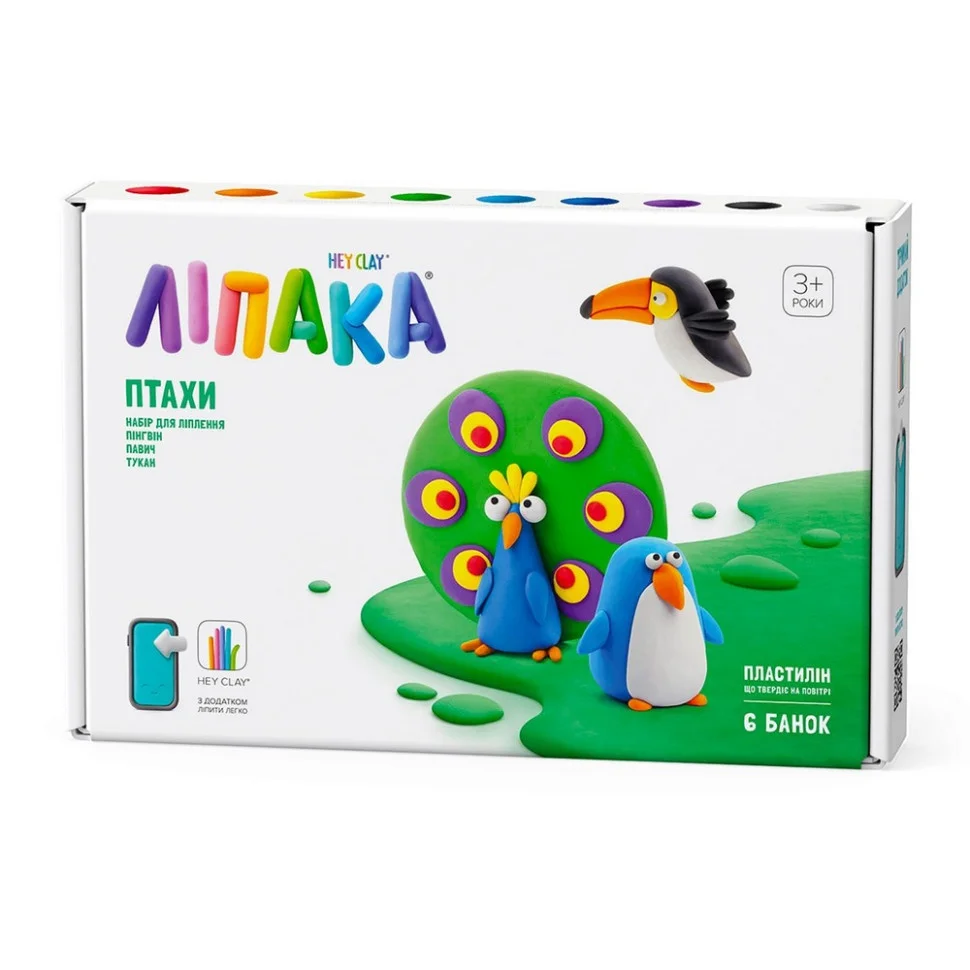 Набір пластиліну, що самостійно твердіє, ЛІПАКА – ПТАХИ: ПІНГВІН, ПАВИЧ, ТУКАН – розважить і малюків, і дорослих. За допомогою анімаційних інструкцій в додатку HEY CLAY, Ви зможете зліпити трьох кумедних пташок. Пластилін твердіє на повітрі протягом 24 годин, після чого можна гратися створеними фігурками.