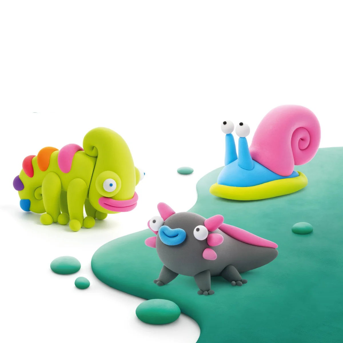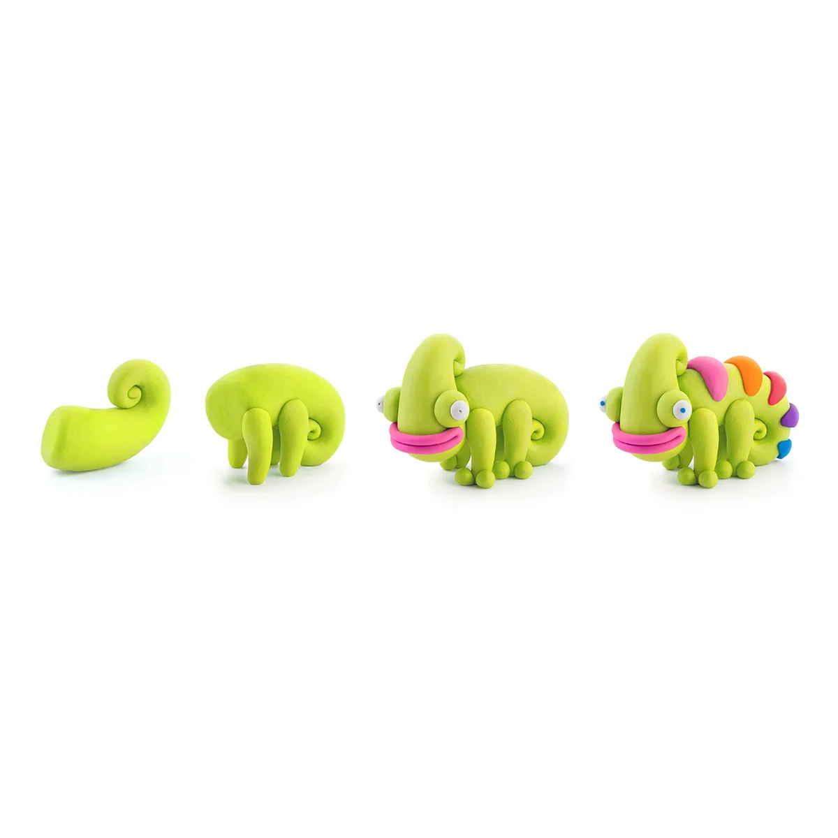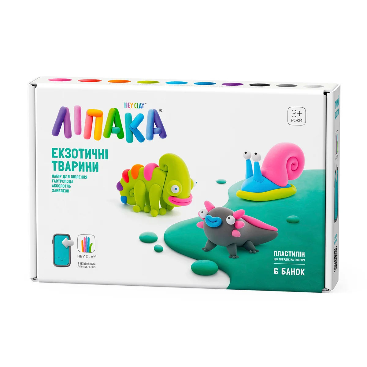 Набір пластиліну, що самостійно твердіє, ЛІПАКА - ЕКЗОТИЧНІ ТВАРИНИ: ХАМЕЛЕОН, ГАСТРОПОДА, АКСОЛОТЛЬ – розважить і малюків і дорослих. За допомогою анімаційних інструкцій в застосунку HEY CLAY, Ви зможете зліпити кумедних хамелеона, гастроподу й аксолотля. А завдяки компактним розмірам, набір зручно брати з собою. Пластилін твердіє на повітрі протягом 24 годин, після чого можна гратися створеними фігурками.