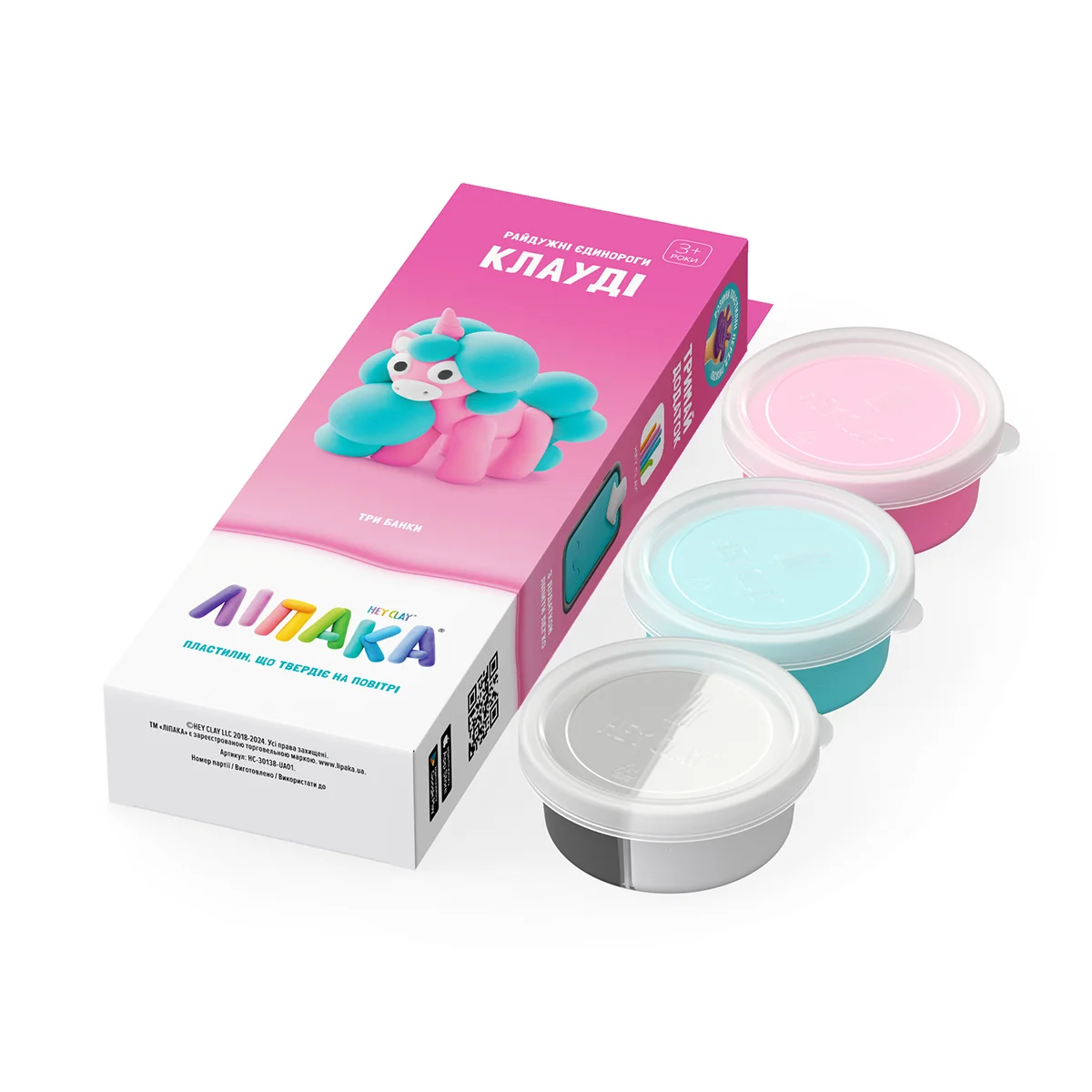 Набір пластиліну, що самостійно твердіє, ЛІПАКА - РАЙДУЖНІ ЄДИНОРОГИ: КЛАУДІ – розважить і малюків і дорослих. За допомогою анімаційних інструкцій в застосунку HEY CLAY, Ви зможете зліпити милу єдиноріжку Клауді. А завдяки компактним розмірам, набір зручно брати з собою. Пластилін твердіє на повітрі протягом 24 годин, після чого можна гратися створеними фігурками.