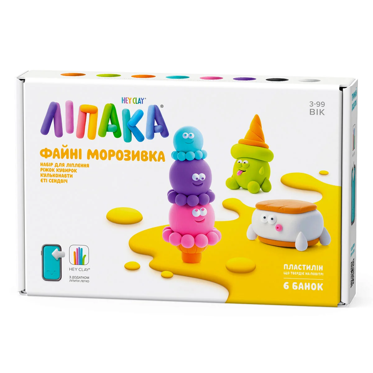 Набір пластиліну, що самостійно твердіє, ЛІПАКА – ФАЙНІ МОРОЗИВКА: КУЛЬКОНАВТИ, ЄТІ СЕНДВІЧ, РІЖОК КУВИРОК – розважить і малюків, і дорослих. За допомогою анімаційних інструкцій в додатку HEY CLAY, Ви зможете зліпити трьох кумедних героїв. Пластилін твердіє на повітрі протягом 24 годин, після чого можна гратися створеними фігурками.