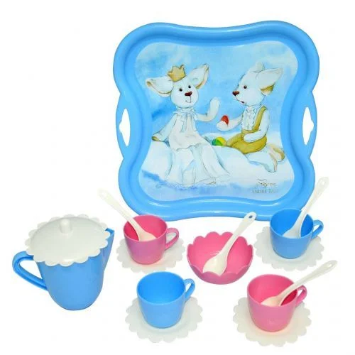 Гарний пластиковий дизайнерський набір для чаювання, ніжного блакитного кольору. У наборі: піднос з термонаклейка, чайничок з кришечкою, 4 чашечки, 4 блюдця, цукорниця і 4 чайні ложечки.