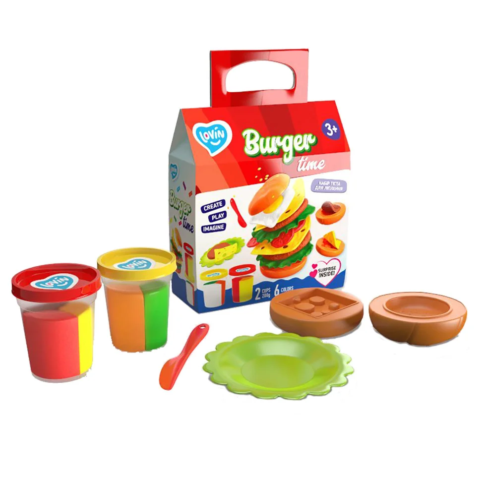 Кольорове приємне на дотик тісто для ліплення, оригінальний великий молд-дощечка для формування компонентів страви, пластиковий ніж, та зручна інструкція з рецептами найсмачнішого бургера.