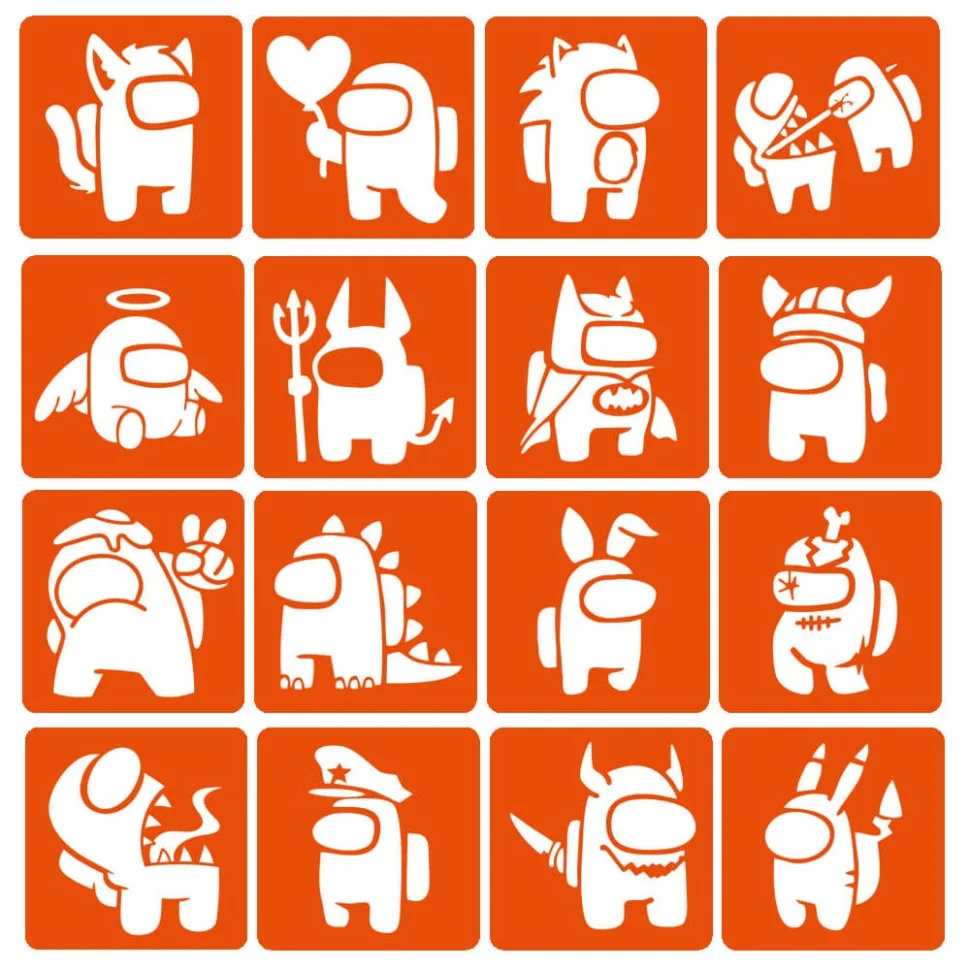 Це набір із 16 нових трафаретів, створених за мотивами популярної гри Among Us. Колекція підходить для створення біо-тату та гліттер-тату, а також для творчих занять і тематичних заходів.