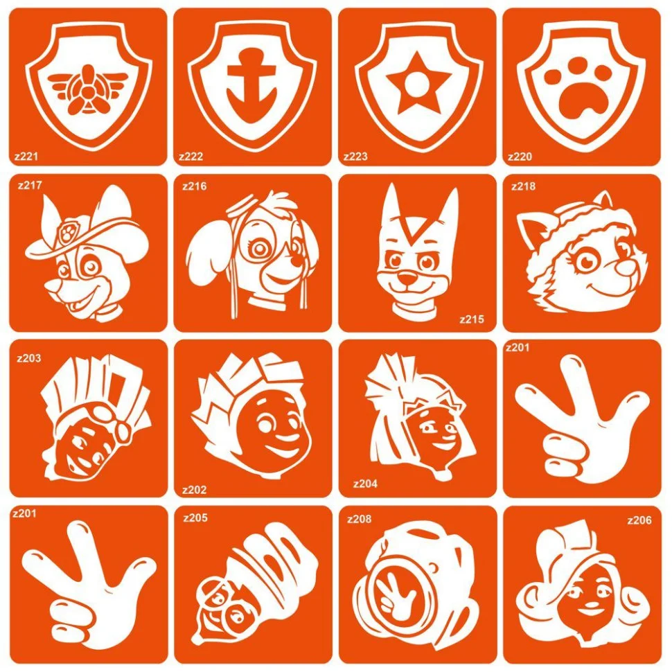 Колекція трафаретів Фіксиків та Щенячого патруля, 16 штук у розмірі 6 на 6 см.