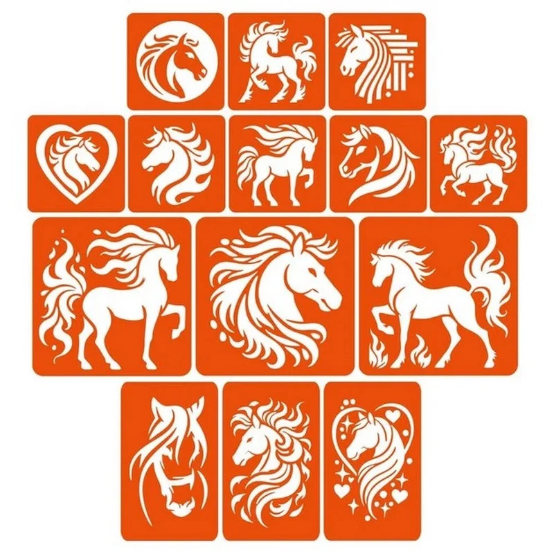 Колекція простих трафаретів "Коні - великий мікс", 14 штук у розмірах від 6*6 до 10*10 см.