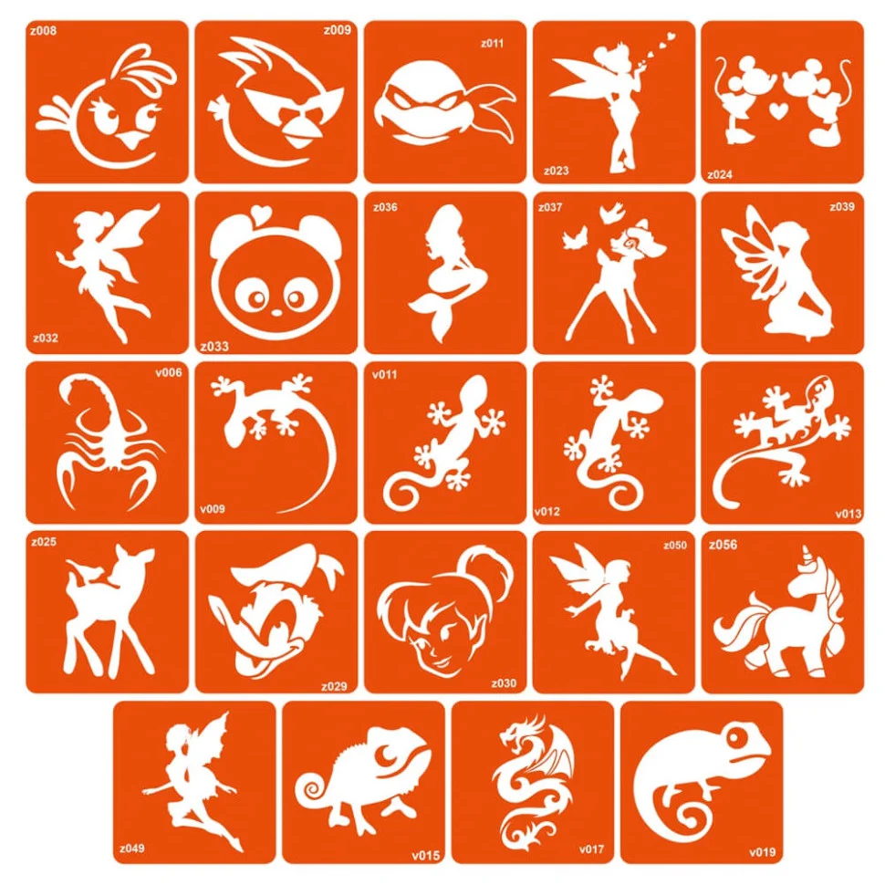 Колекція простих трафаретів драконів, ящірки та мультики, 24 штуки в розмірі 6 на 6 см.
