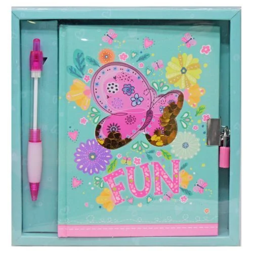 Симпатичний подарунковий набір з яскравим блокнотом на замочці та ручкою. На обкладинці блокнота є прозоре віконце, через яке видно кишеньку з золотистими блискітками. Закривається на замочок, у комплекті є два ключики. 56 аркушів у лінію. Розмір блокноту 19х10 см.