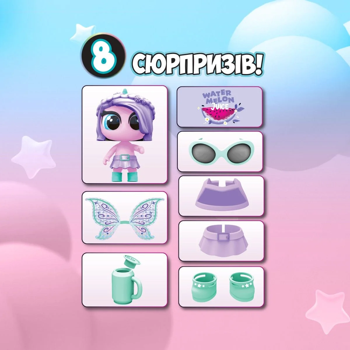- У наборі 8 різних сюрпризів: єдиноріг, крила, окуляри, одяг, взуття, кухоль, наліпки.