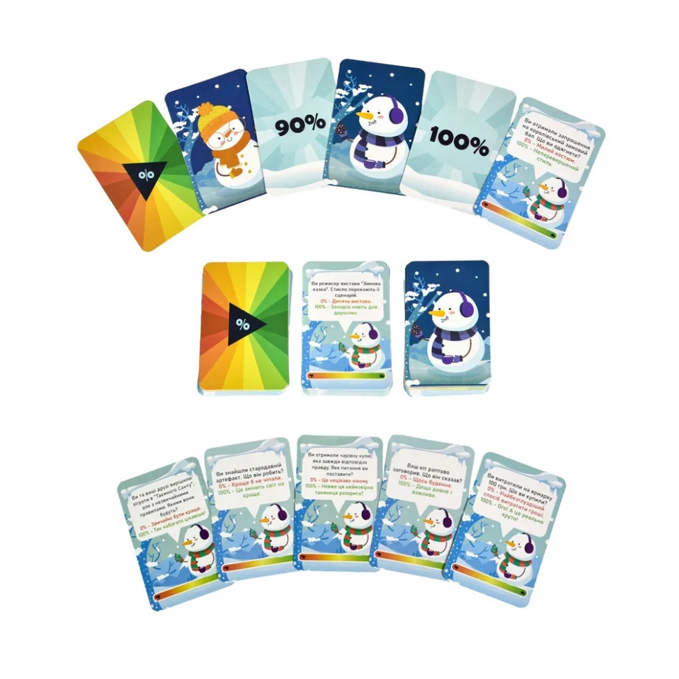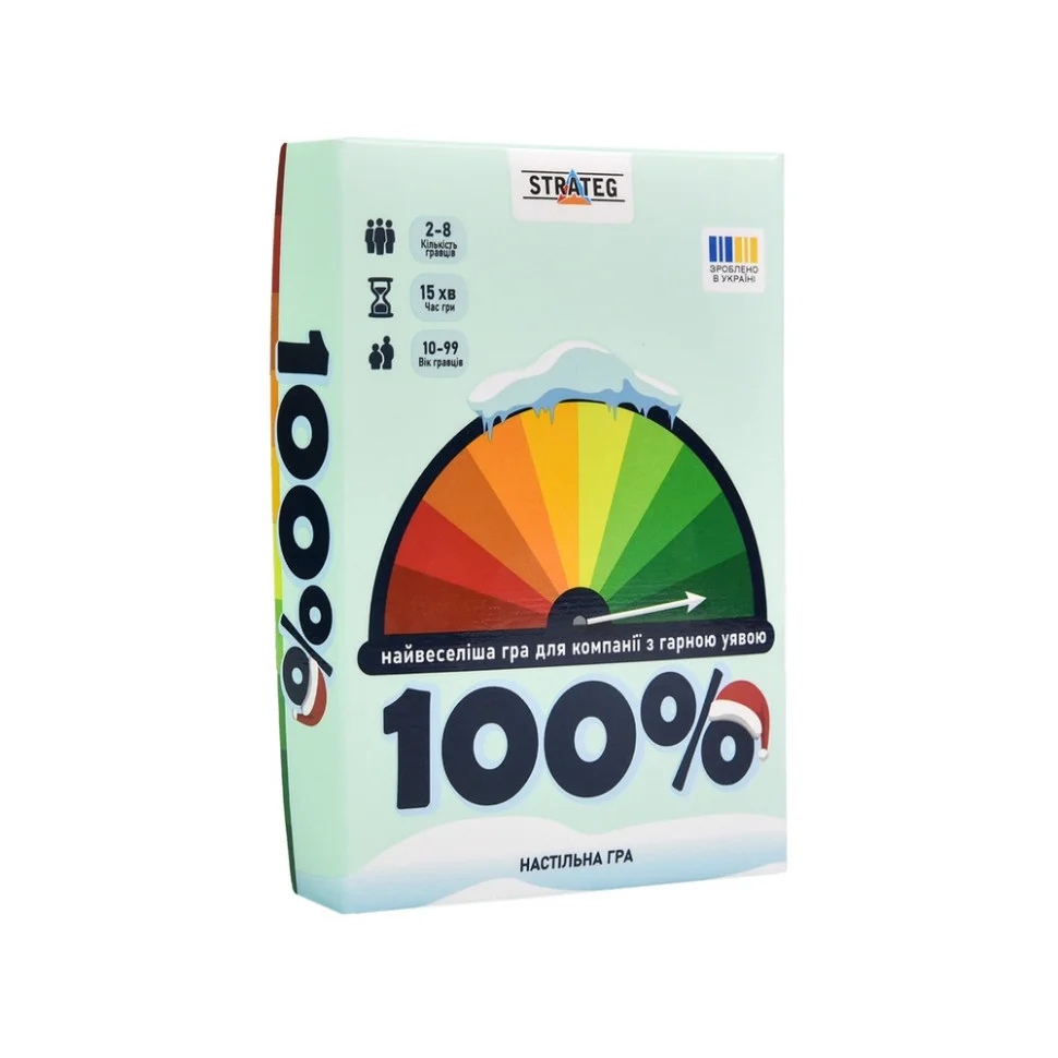 "100%" — це кооперативна гра на асоціації, в якій гравці об’єднують свої сили, щоб подолати виклики самої гри. У кожному раунді на вас чекають унікальні завдання, де фантазія та винахідливість стануть вашими незамінними союзниками! Гра наповнена атмосферою зимових свят, веселощів і непередбачуваних моментів, які подарують вам незабутні емоції. Це ідеальний вибір для сімейного відпочинку, зустрічей з друзями або створення святкового настрою. Готові зануритись у світ креативу та сміху? Обирайте "100%"!
