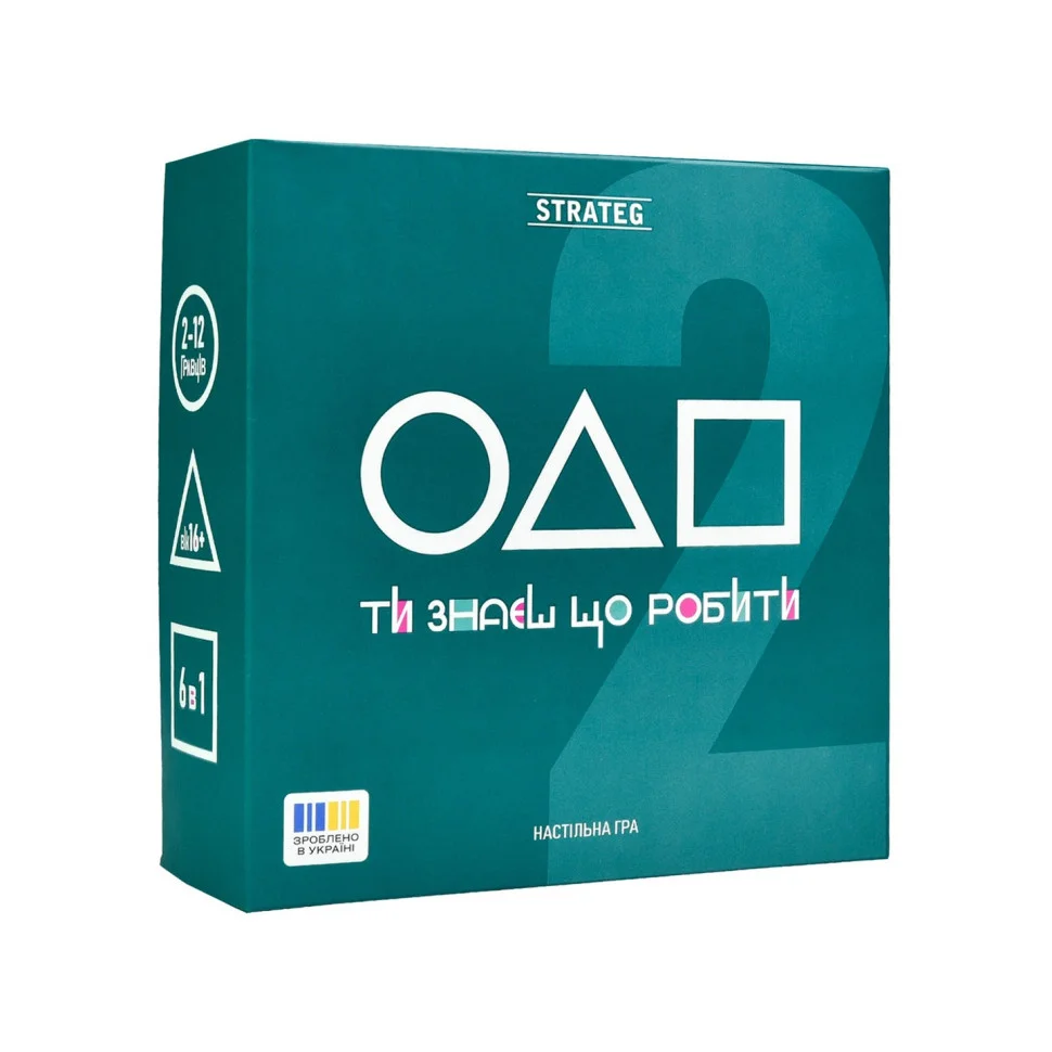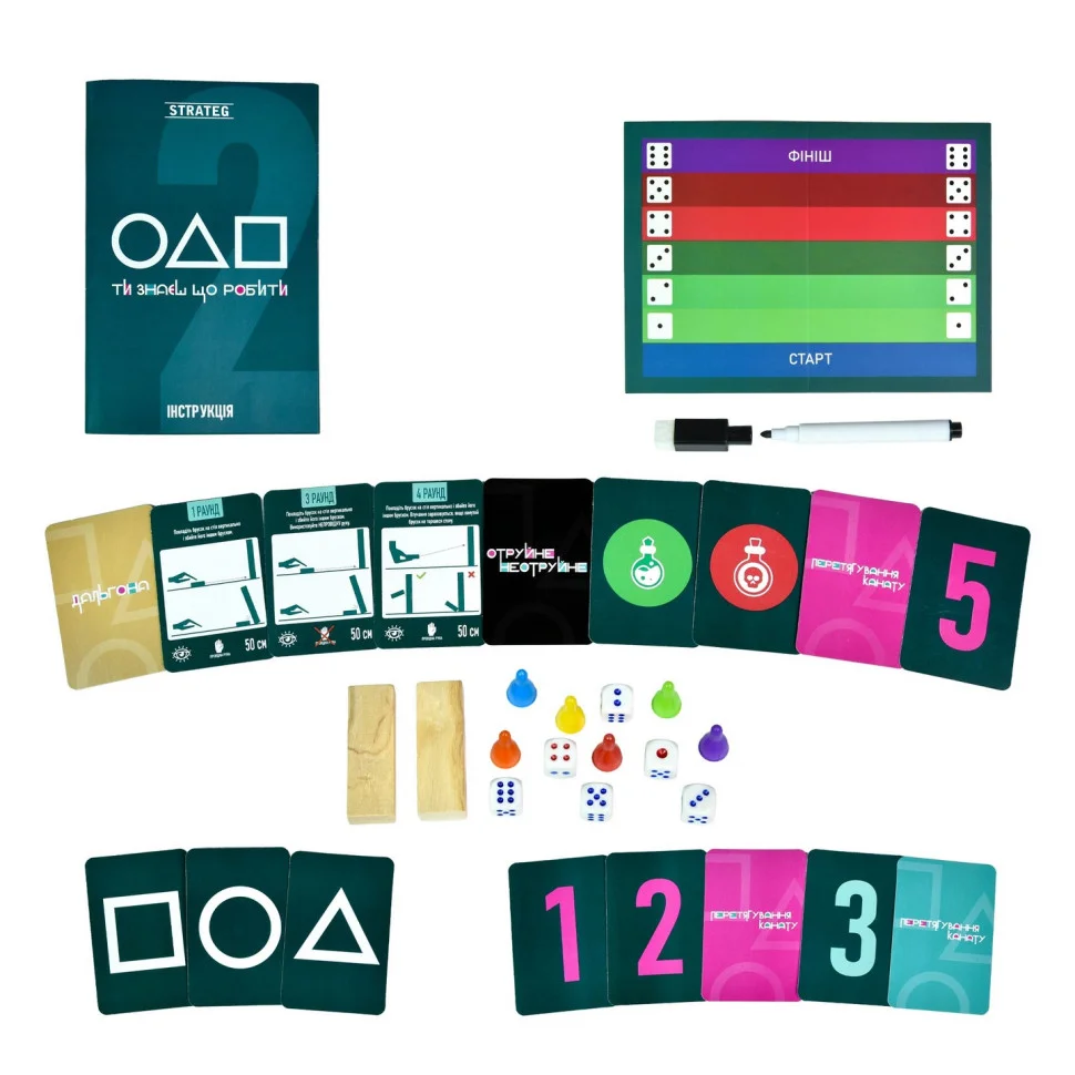 Комплектація: коробка, ігрове поле, гральні кубики - 6 шт., фішки - 6 шт., дерев'яні бруски - 2 шт., маркер, картки 54 шт., прозора картка, інструкція.