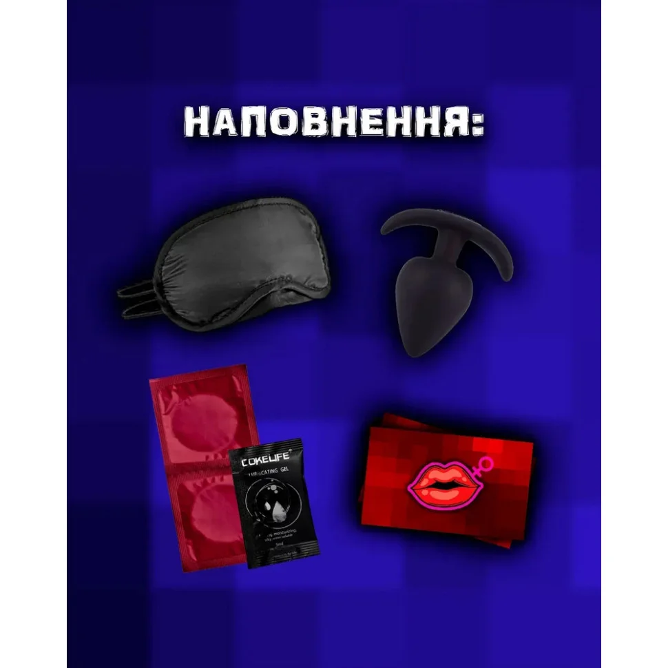 Наповнення: 69 карток; Ан*льна пробка; Лубрикант; Пов‘язка на очі; Презервативи.