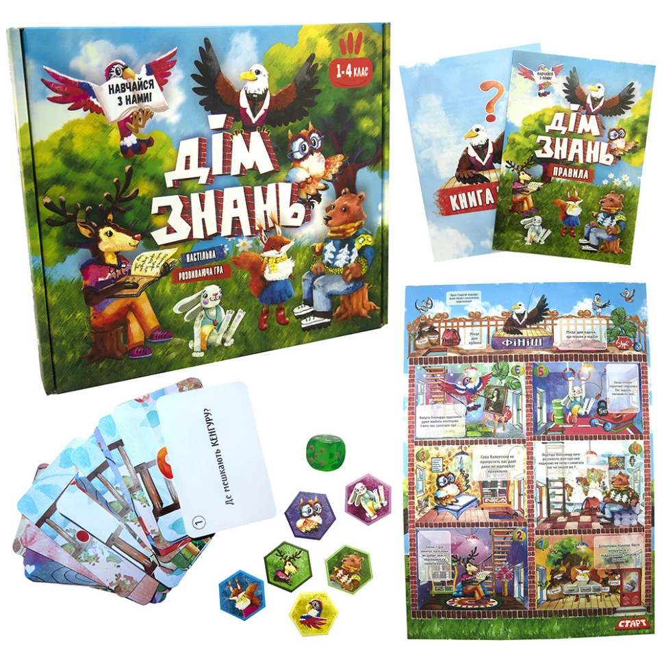 Великий будинок, в кожній квартирі, якого живуть забавні мешканці - тварини, які люблять ставити цікаві запитання, чекають малюка в настільній грі «Будинок знань». Гра для компанії до 6 осіб - зможе зацікавити не тільки дітей, а й дорослих, дасть можливість цікаво провести час всій родині, при цьому проявити свої здібності і отримати нові знання. Відповідно до очками, випали на кубику, гравці пересувають фішку на ігровому полі, на якому є багато завдань, загадок і підказок, які роблять гру ще цікавіше. Ігрове поле прикрашене барвистими малюнками із зображеннями мешканців будинку. В процесі гри необхідно відповісти на питання звіряток, розгадати загадки і подолати перешкоди. Питання на картках різні - з області математики, спорту, зоології та казок. Перемагає той, хто першим прийде до фінішу - набравши максимальну кількість очок за правильні відповіді! Гра допоможе в навчанні і розвитку дитини. Правильні відповіді на питання наведені в спеціальній Книзі знань. Правила прості, але гра захопить учасників з першої партії. Перед початком гри велике ігрове поле необхідно зібрати - воно виконано у вигляді пазла. Мова українська.