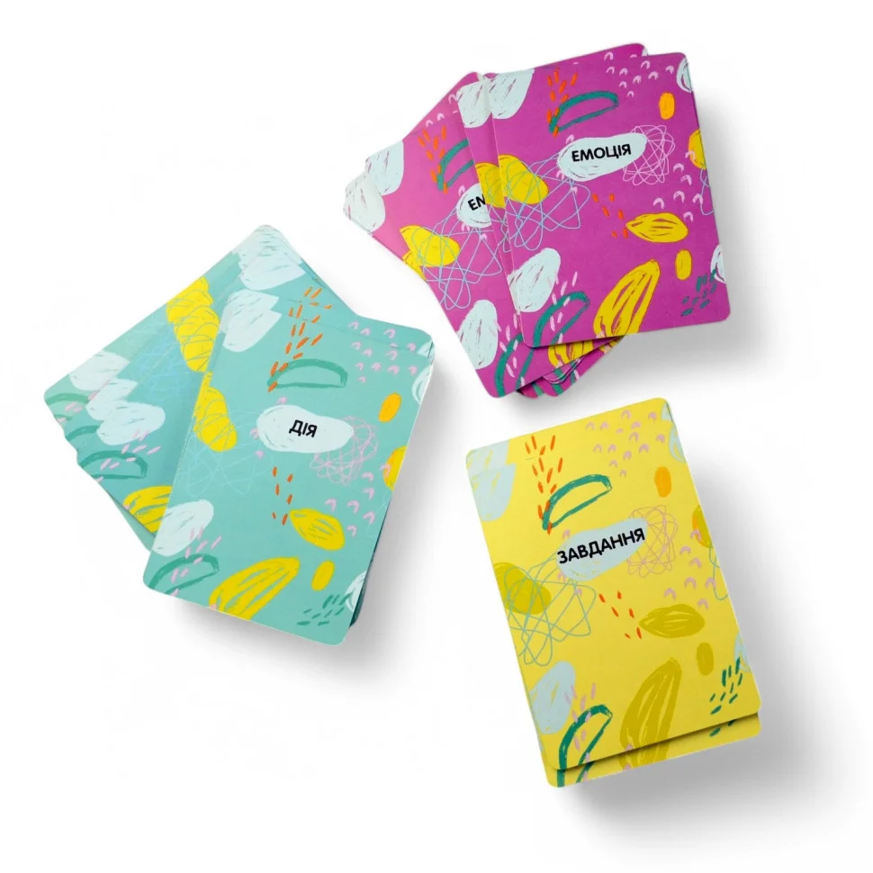 Сім варіантів гри, для гравців різного віку та настрою: дія-наслідок, меморі, крокодил, покажи тілом, вислови голосом, зроби гримасу і т.д.