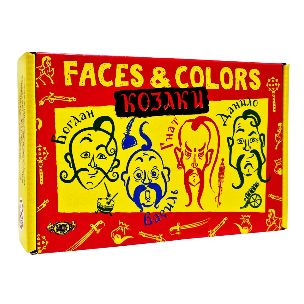 -24 ігрові картки із зображенням козаків-Богдан, Василь, Гнат, Данило( у трьох кольорах:червоний, синій і зелений)-по дві картки кожного героя у кожному кольорі;