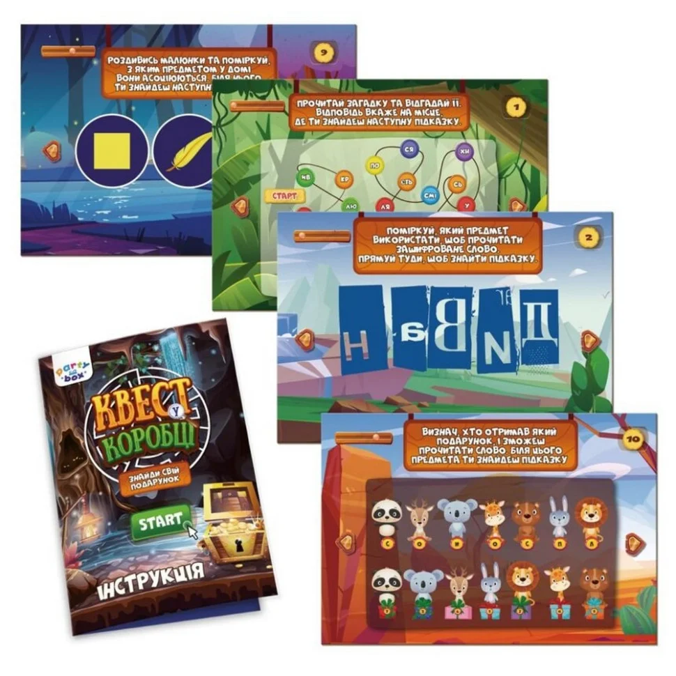 Квест у коробці “Відеогра”- цікавий ігровий відпочинок в домашніх умовах. Просто! Швидко! Цікаво! Розкладені картки з завданнями приведуть до підказок, а підказки до бажаного скарбу. Діти і дорослі охоче втягнуться в розважальну гру!