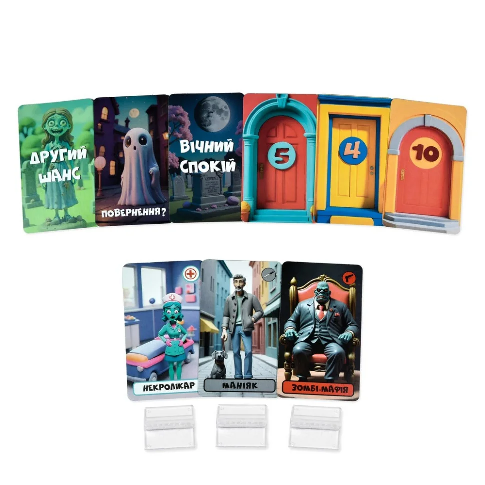 Комплектація: картки ролей - 12 шт, картки-номери - 12 шт, картки повернення - 12 шт, підставки - 12 шт, інструкція.